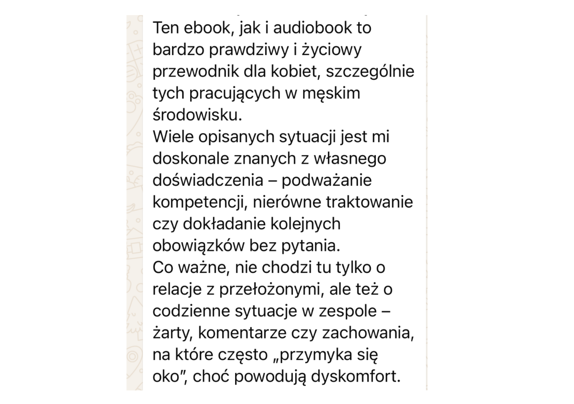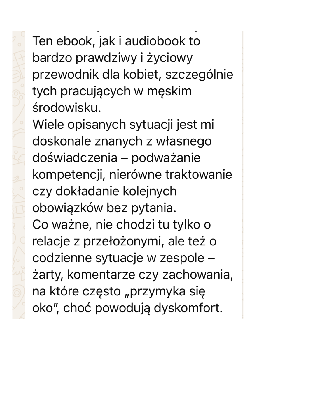 Nie znajdziesz w nim ogólnych porad. Zebrałam tam 39 konkretnych sytuacji z pracy, które pewnie doskonale znasz, od publicznej krytyki, przez „wrzutki” przed wyjściem, aż po podważanie Twoich kompetencji.